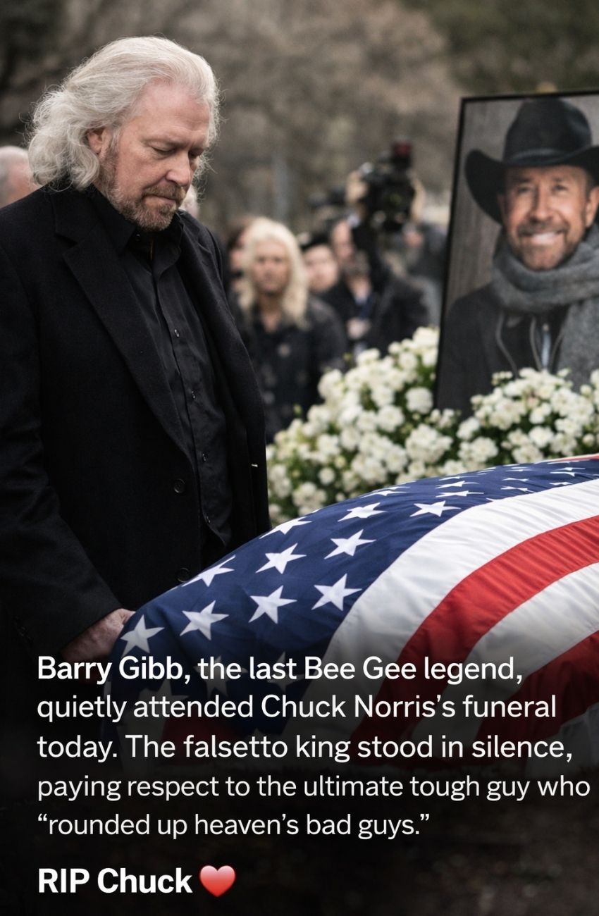 In the most unexpected moment of grief, a quiet and deeply moving scene unfolded today as music legend Barry Gibb, the last surviving member of the iconic Bee Gees, was seen attending the funeral of actor and martial arts icon Chuck Norris.